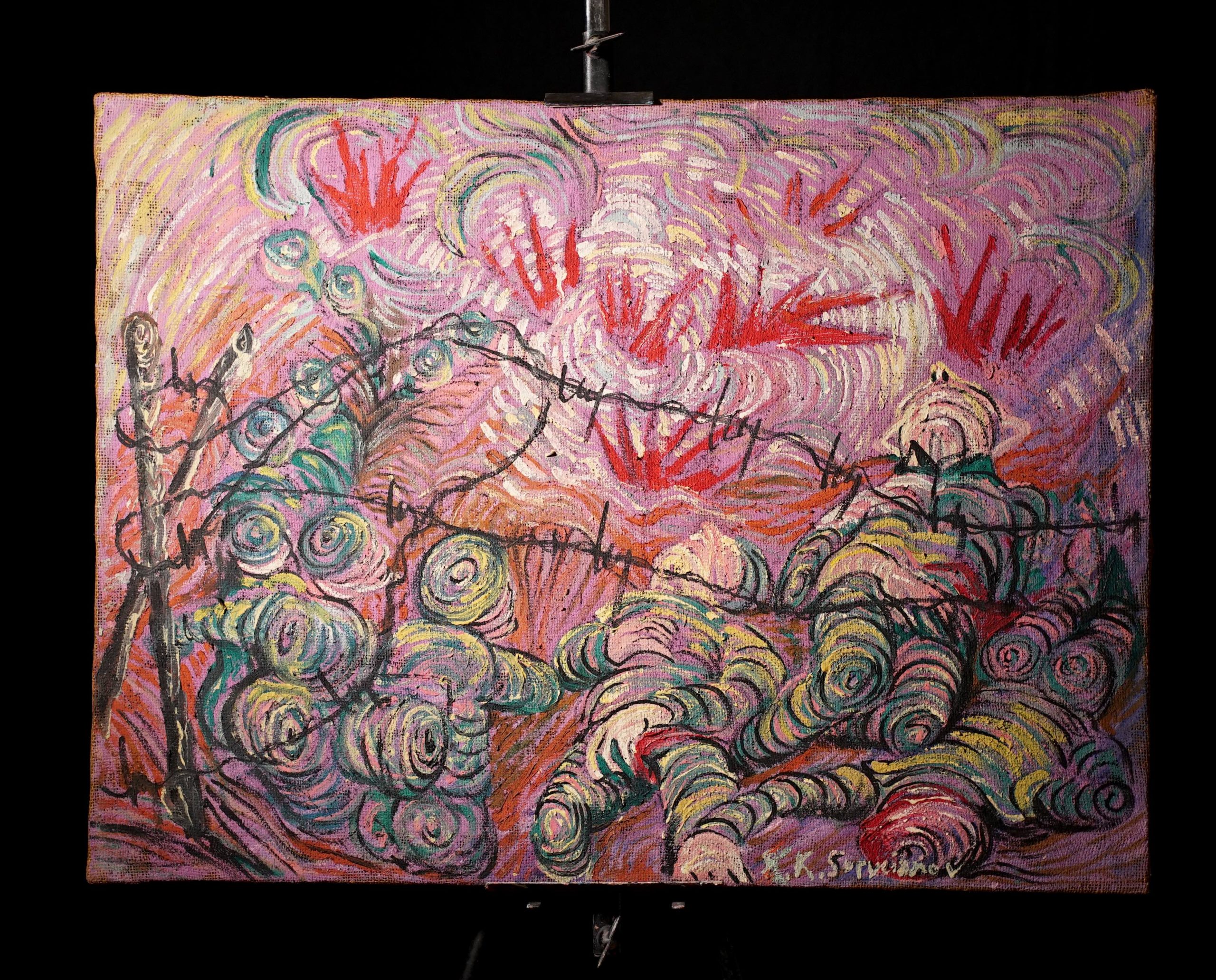 A swirl of signs and shapes amid tumultuous landscapes.